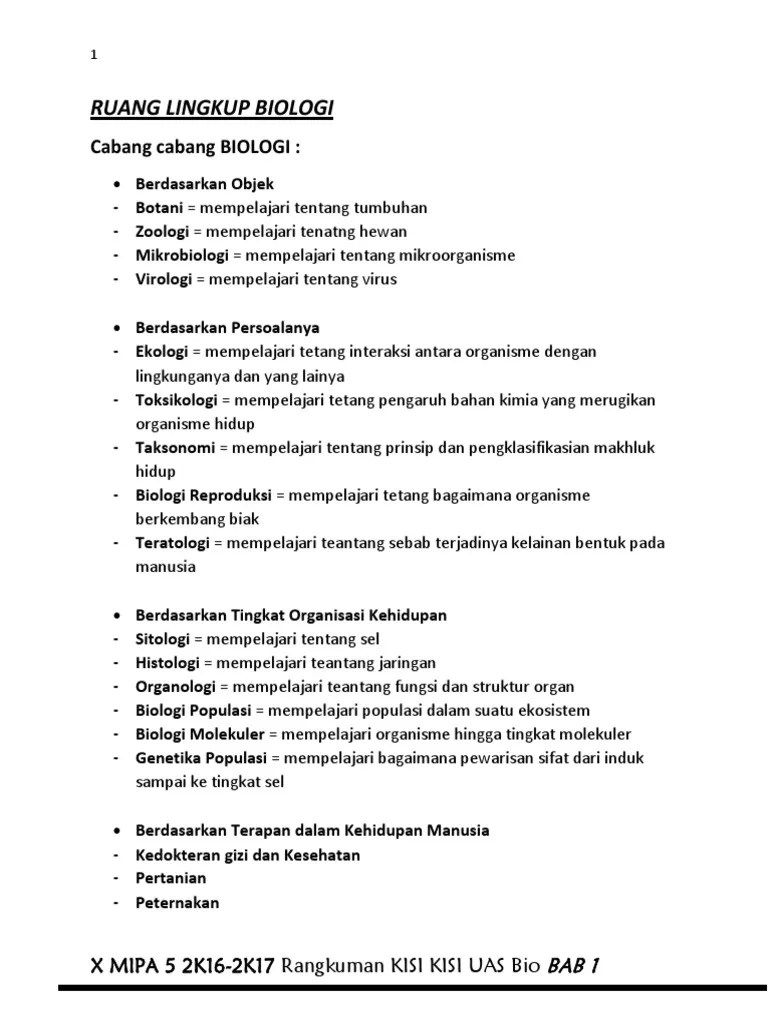 Materi biologi bab 1 kelas 10 tentang ruang lingkup biologi, metode ilmiah, dan prinsip keselamatan kerja. Pahamifren, bicara tentang biologi memang nggak ada habisnya ya. Biologi merupakan ilmu mengenai makhluk hidup beserta lingkungannya. Menjelaskan ruang lingkup biologi dan keterkaitan biologi dengan metode ilmiah; Rangkuman materi akan mempermudah kalian untuk menemukan poin penting.